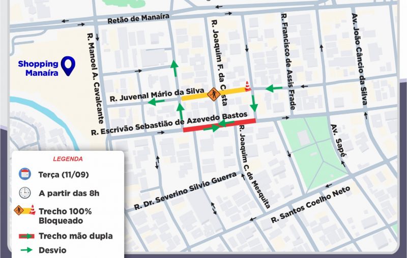 O trânsito no bairro de Manaíra tem mudanças nesta quinta-feira (11) por causa de obras da Cagepa. De acordo com a Superintendência Executiva de Mobilidade Urbana (Semob-JP), a Rua Juvenal Mário da Silva será bloqueada para serviços de expansão da rede de esgotamento sanitário.
