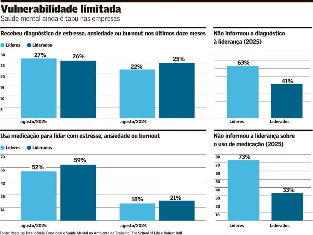 O ambiente corporativo brasileiro ganhou um novo protagonista em 2025: a cartela de comprimidos. Pesquisa conduzida pela The School of Life em parceria com a consultoria Robert Half mostra que o consumo de medicamentos para estresse, ansiedade e burnout cresceu em ritmo vertiginoso neste ano. Entre líderes, a proporção de usuários saltou de 18% para 52% em apenas doze meses; entre liderados, a variação foi ainda maior, de 21% para 59%.