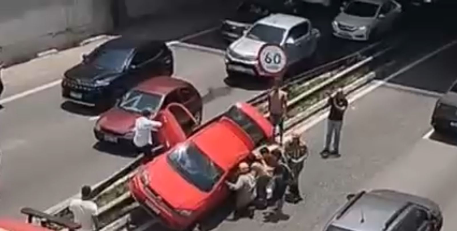 Com a força do impacto, um Volkswagen Gol ficou suspenso sobre o guard-rail que divide as pistas. No veículo estavam três pessoas: uma mulher, que precisou ser socorrida por uma ambulância do Corpo de Bombeiros, e outros dois ocupantes, que tiveram ferimentos leves e receberam atendimento no local.